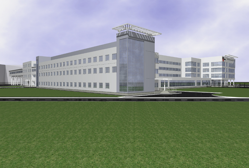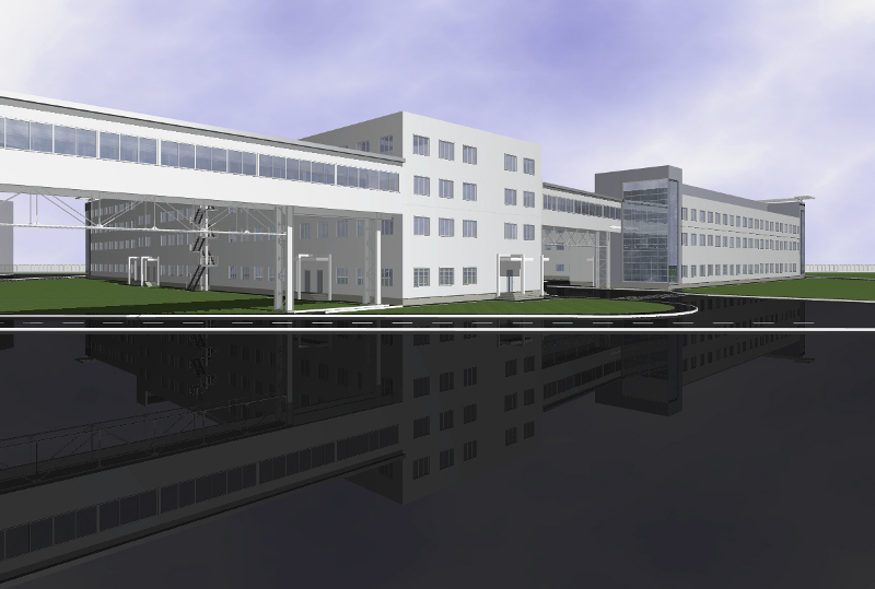 Крупномасштабность основных зданий комплекса, разновысотность объемов, создают выразительный архитектурный облик административного здания, хорошо видимый со стороны главного въезда на территорию промышленной площадки завода.